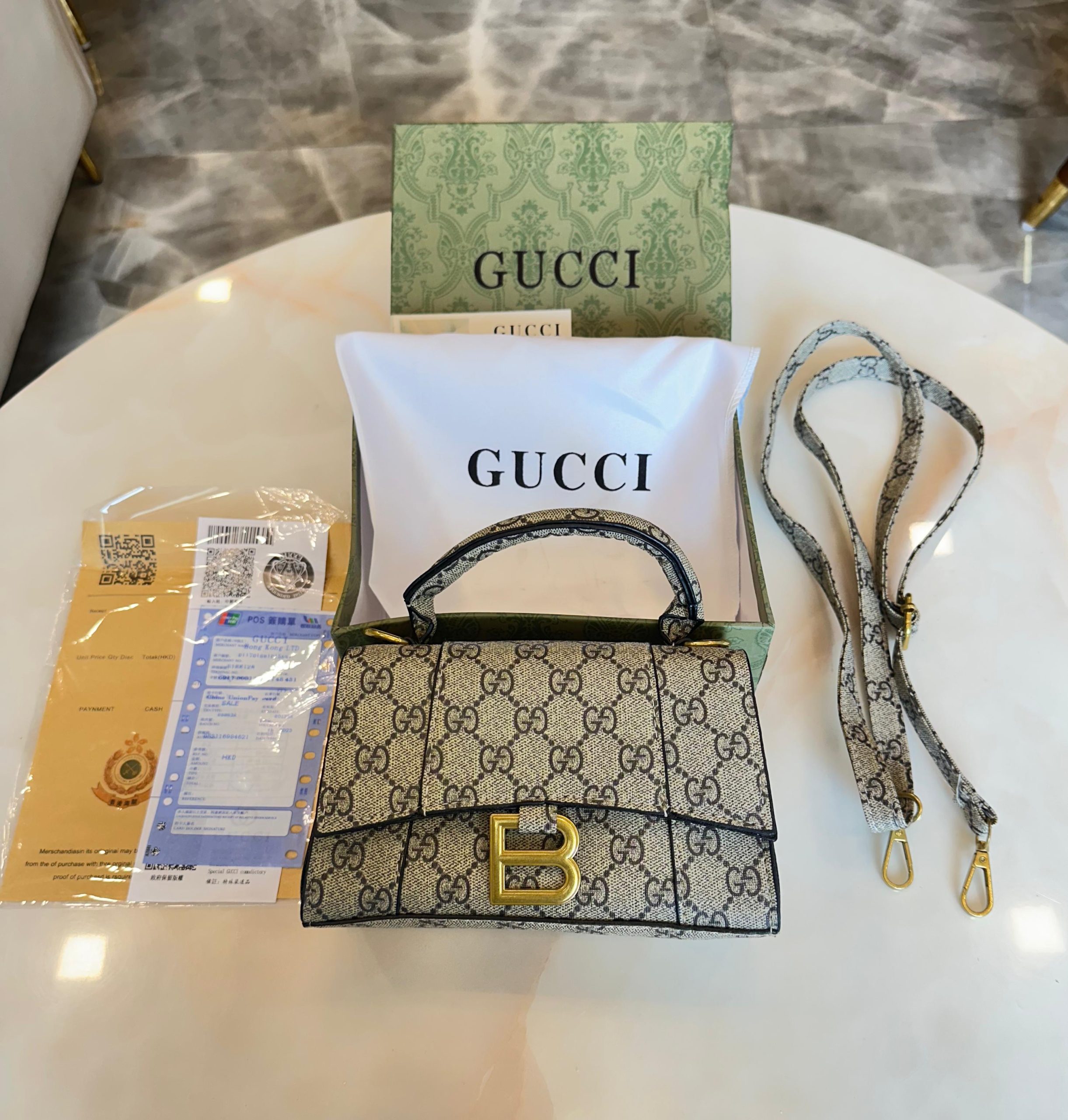 Experience the bold fusion of two luxury powerhouses with the Gucci x Balenciaga First Copy Premium Bag. Designed for fashion lovers who appreciate statement pieces, this bag blends iconic GG patterns with Balenciaga’s modern aesthetic—delivering a standout accessory that elevates any outfit.